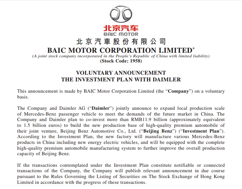 On February 23, 2018, BAIC Motor Corporation Limited (BAIC MOTOR) and Daimler AG jointly announced to invest over RMB 11.9 billion (about 1.5 billion euros) to upgrade the factory of Beijing Branch of BAIC MOTOR in Shunyi District of Beijing, building a new luxury car manufacturing base for Beijing Benz Automotive Co., Ltd. (Beijing Benz).