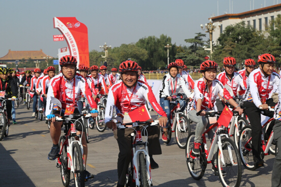 比賽之外,更加引人矚目的當屬“榮譽騎行”環節:只見350位身著專業自行車比賽服的騎手,腳蹬亮眼的公路自行車,緊跟大部隊之后,環繞天安門廣場進行了1.7公里的騎行。本以為他們也是專業的騎手,一問下來才知道,原來他們都是本次“環京賽”保障團隊和贊助團隊的工作人員。用“環京賽”組委會負責人的話說就是,希望用“榮譽騎行”這種形式回饋為“環京賽”作出貢獻的人們,同時也讓他們參與到自行車這項運動員中來,讓綠色出行成為新的選擇、新的行為方式。