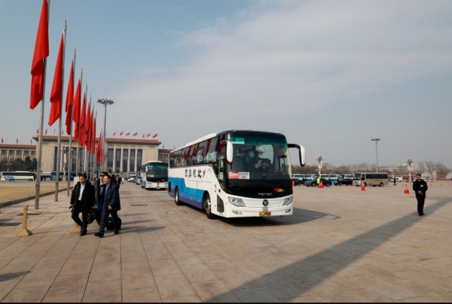 本次兩會中,BJ6906城間客車是首次作為兩會服務用車亮相。該車型是福田歐輝面向中高端公路客運市場和旅游市場推出的明星產品,具有外觀新穎、動力十足、節油高效等優勢,能為兩會代表提供高品質的出行體驗。車輛采用全新商務美學外觀,造型端莊、線條流暢,車內空間寬敞,通過性好。同時,車內搭載多功能方向盤、iTink智能車聯網系統、智能儀表盤等高端配置,還配置人體工學J型座椅、USB接口、閱讀燈等,為參會代表營造輕松舒適的出行氛圍。還可選配ABS、ESC、胎壓監測等多重主動安全配置,進一步提升車輛安全性。