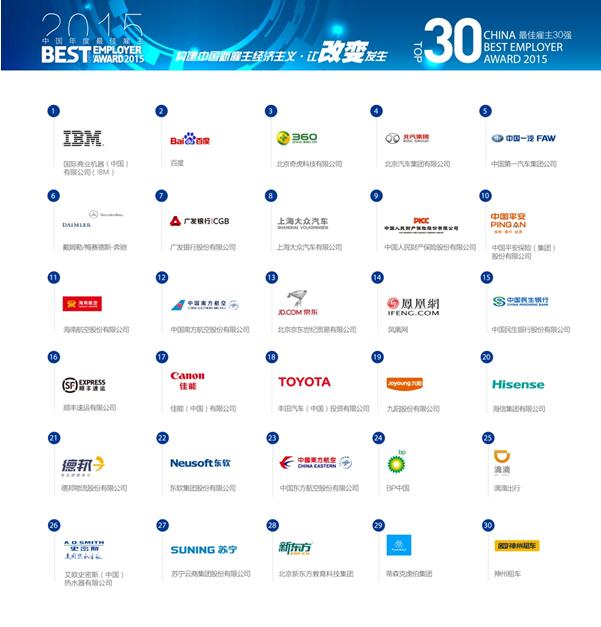 附:2015中國年度最佳雇主30強企業(yè)排名榜單