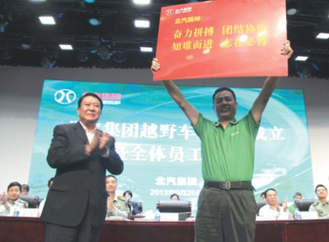 在講話中指出,北汽從越野車起家,創造了歷史的輝煌,可以說越野車就是北汽集團的‘眼珠子’!今天,恰逢天時地利人和的好時機,北汽要重新高舉起‘越野世家’這桿大旗,當仁不讓!這是我們的決策也是決心。因此,從基地建設到產品開發,北汽拿出上百億資金,吸收眾多精兵強將專門打造自主品牌越野車,相信北汽在越野車市場一定能做到全國第一,希望每一位將士不辱使命、珍惜機會。