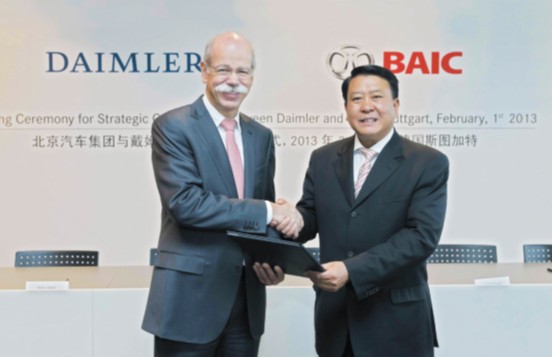 2013年2 月1 日,北京汽車集團有限公司與戴姆勒股份公司高層在德國斯圖加特奔馳總部簽署了戰略入股等一系列協議,進一步深化雙方戰略合作伙伴關系。根據協議,北汽集團將持有北京奔馳公司51%股權,實現對合資公司的控股地位,同時為北汽股份公司上市邁出戰略性一步。