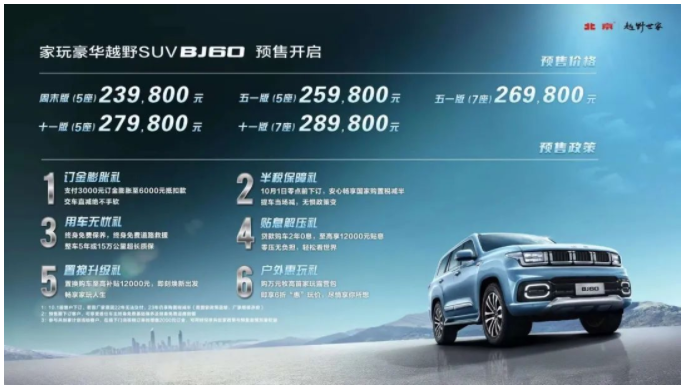 北京越野為BJ60打造了極富誠(chéng)意的多重購(gòu)車禮:支付3000元訂金膨脹至6000元抵扣款;終身免費(fèi)保養(yǎng),免費(fèi)道路救援,整車5年或10萬(wàn)公里超長(zhǎng)質(zhì)保;貸款購(gòu)車2年0息,至高12000元貼息;置換補(bǔ)貼至高12000元、6折選購(gòu)原值萬(wàn)元家玩露營(yíng)包。